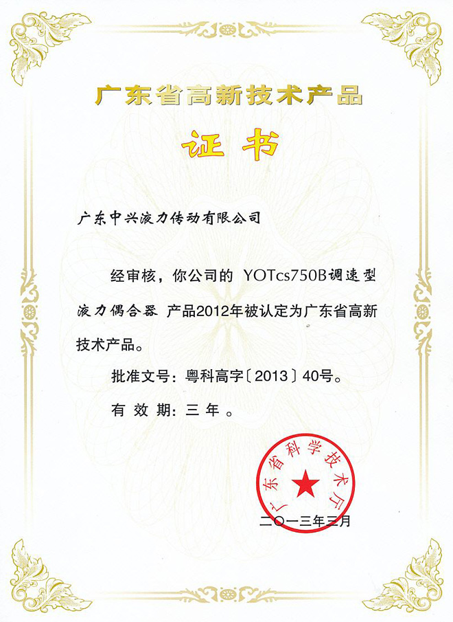 YOXD750液力偶合器高新技術(shù)產(chǎn)品證書(shū)